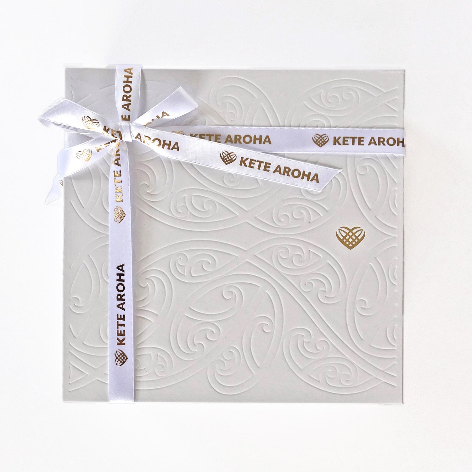 Each Kete Aroha gift box is made to order and hand-packed with care. Every item is nestled in soft tissue and premium shredded fill, encased in our embossed black or white box, and finished with a hand-tied ribbon and personalised message card, a timeless expression of elegance, grace, and aroha for any occasion.